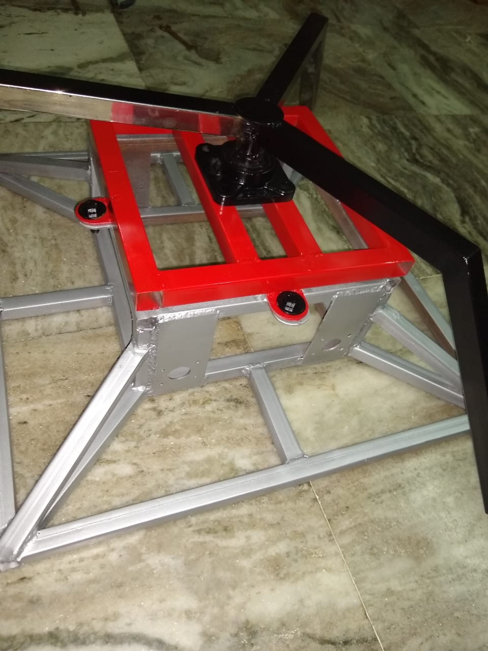 Our design featured a top-rotor with three hammers, spinning at high RPMs to deliver crushing impacts. The bot’s body was reinforced with tough steel armor for durability. For mobility, we used four aluminum wheels (two on each side), powered by high-torque DC motors. The weapon system was driven by an e-bike motor, providing both speed and brute force.